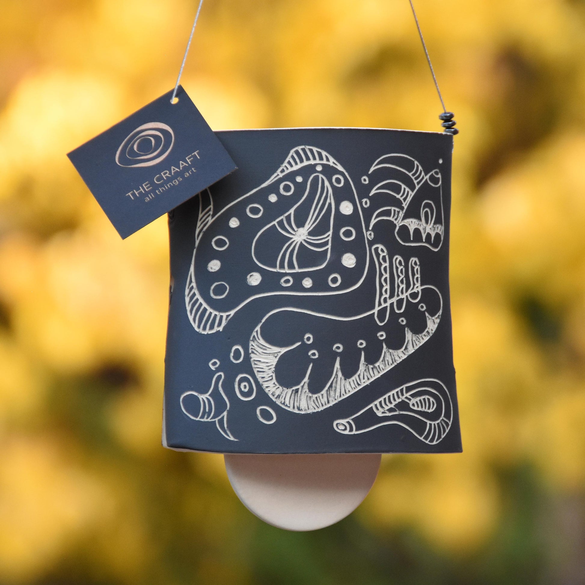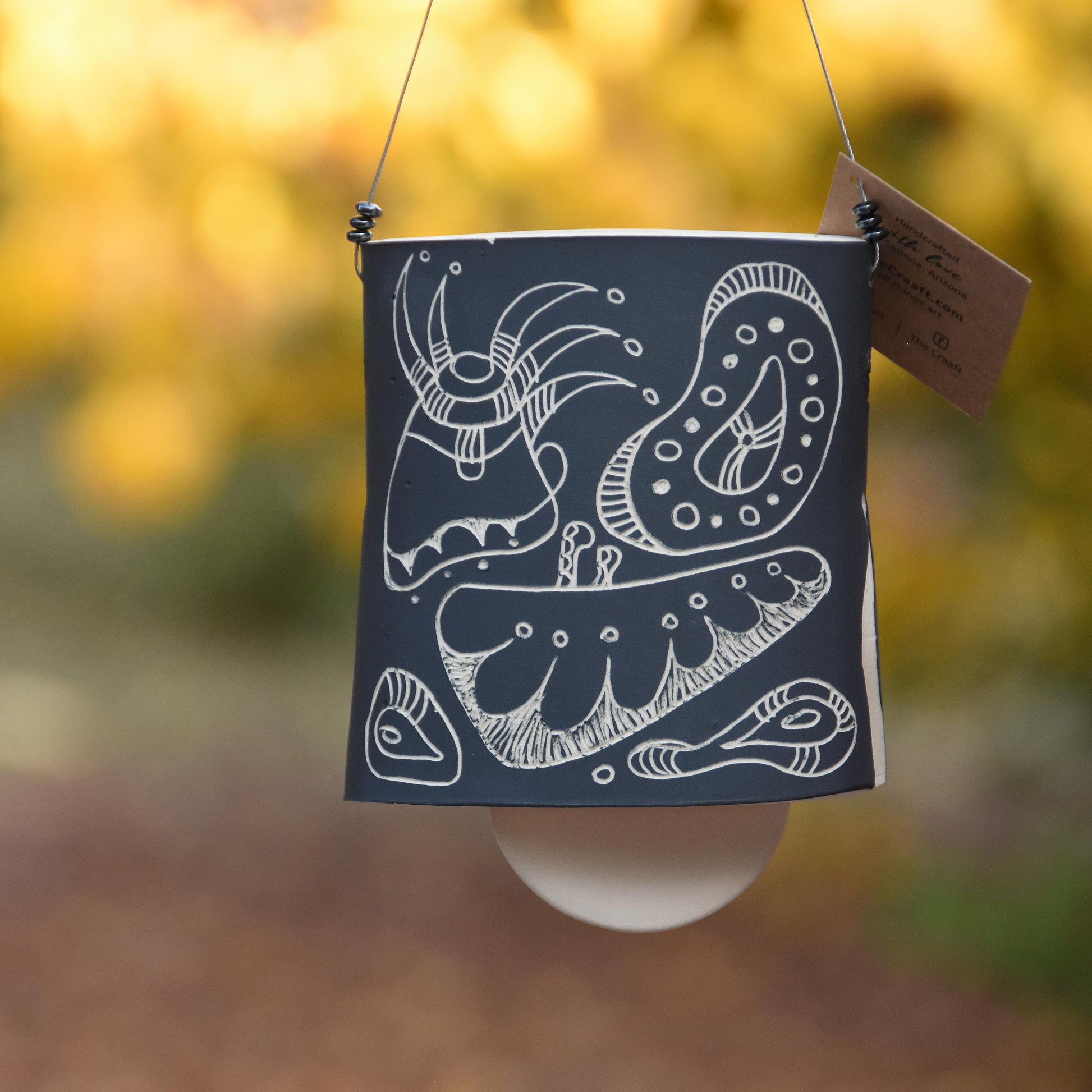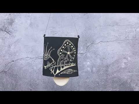 Crafted using the sgraffito technique, this distinctive wind chime bell, drawing inspiration from sea shells, corals, and invertebrates, is sure to capture your imagination and is indeed a one-of-a-kind bell. The free form design that slightly differs on each side is carved into a white body of clay that was coated with a rich, black velvet underglaze, and the sound holes that are featured on the side of this bell emit a distinct, full-bodied sound. Let this exceptional chime infuse a one-of-a-kind essence to your outdoor space. Other designs and colors are coming soon so check back often!